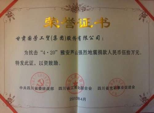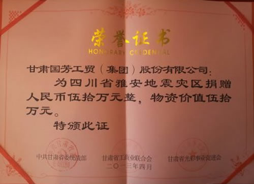 北京時(shí)間2013年4月20日8時(shí)02分,四川省雅安市蘆山縣發(fā)生7.0級(jí)大地震,作為甘肅省知名企業(yè)以及“甘肅省十大慈善單位”,國(guó)芳集團(tuán)在第一時(shí)間向?yàn)?zāi)區(qū)捐贈(zèng)50萬(wàn)元現(xiàn)金和50萬(wàn)元的物資,向?yàn)?zāi)區(qū)群眾送去一份愛(ài)心,這一善舉得到了廣大社會(huì)輿論的好評(píng)和百姓的良好口碑,并得到了四川、甘肅兩省,省委統(tǒng)戰(zhàn)部、省工商聯(lián)、省光彩事業(yè)促進(jìn)會(huì)的表?yè)P(yáng)和嘉獎(jiǎng)。在此國(guó)芳集團(tuán)呼吁更多的企業(yè)能夠加入社會(huì)公益、慈善的行列里來(lái),讓社會(huì)主義大家庭的溫暖,灑向神州大地,也祝愿雅安同胞早日遠(yuǎn)離苦難,重建家園。