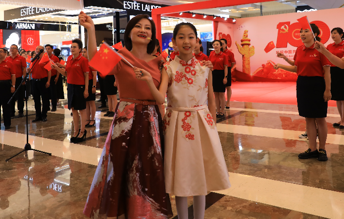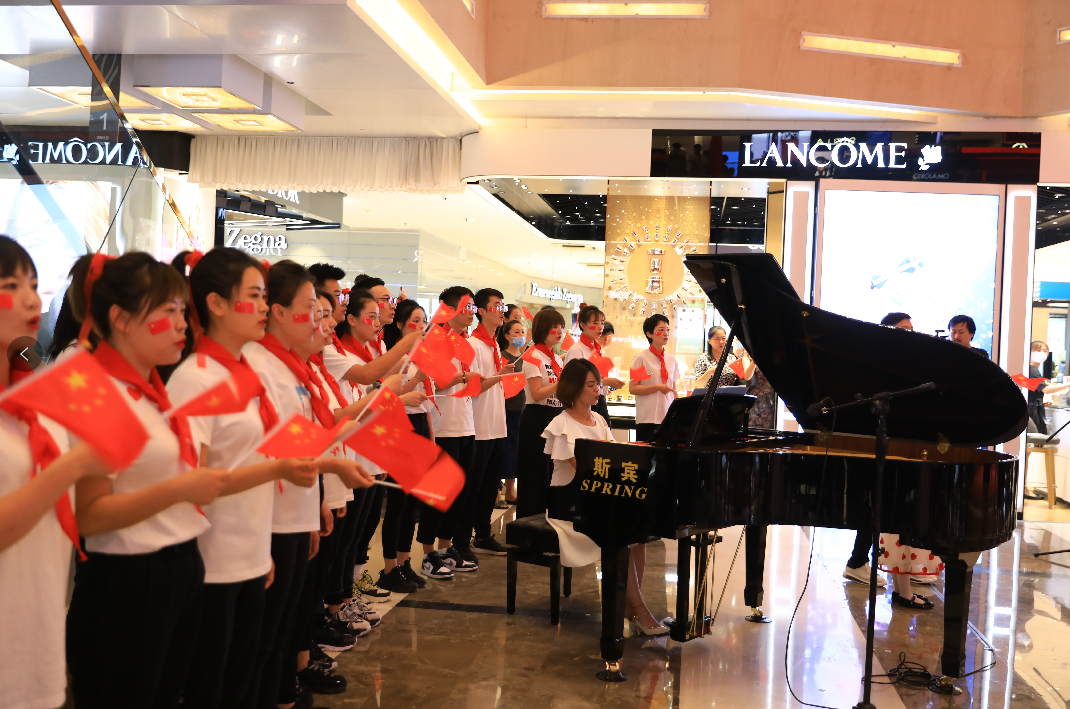 國(guó)芳百貨中廳,隨著鋼琴聲響起,活動(dòng)在男、女領(lǐng)唱“歌唱我們親愛(ài)的祖國(guó),從此走上繁榮富強(qiáng)”的歌聲中拉開(kāi)了活動(dòng)的序幕,30余名國(guó)芳集團(tuán)黨員及員工代表緩緩向主舞臺(tái)走來(lái),大家手持國(guó)旗,組合成“100”字樣,神采奕奕,高聲齊唱。與此同時(shí),現(xiàn)場(chǎng)的圍觀顧客也紛紛加入到隊(duì)伍當(dāng)中,為演出錦上添花。